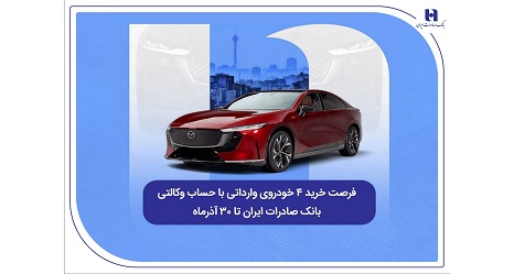 فرصت خرید ۴ خودروی وارداتی با حساب وکالتی بانک صادرات ایران تا روز یکشنبه ۳۰ آذرماه فراهم شد و مشتریان این بانک میتوانند با وکالتیسازی غیرحضوری حساب خود به مبلغ 5 میلیارد ریال، در طرح جدید عرضه خودروهای وارداتی شرکت کنند.