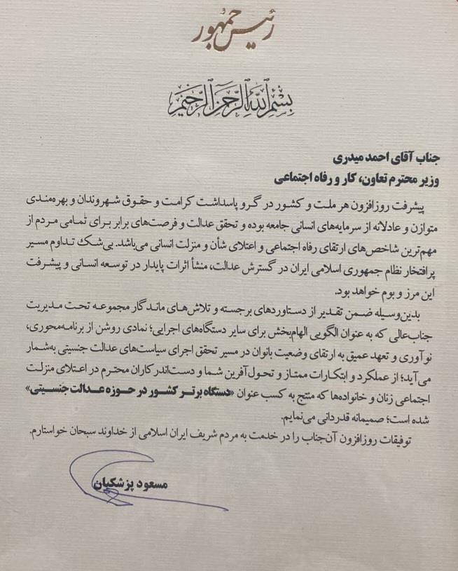 بدین وسیله ضمن تقدیر از دستاوردهای برجسته و تلاش های ماندگار مجموعه تحت مدیریت جناب عالی که به عنوان الگویی الهام بخش برای سایر دستگاه های اجرایی؛ نمادی روشن از برنامه محوری نوآوری و تعهد عمیق به ارتقای وضعیت بانوان در مسیر تحقق اجرای سیاست های عدالت جنسیتی به شمار می آید؛ از عملکرد و ابتکارات ممتاز و تحول آفرین شما و دست اندرکاران محترم در اعتلای منزلت اجتماعی زنان و خانواده ها که منتج به کسب عنوان دستگاه برتر کشور در حوزه عدالت جنسیتی شده است؛ صمیمانه قدردانی می نمایم .