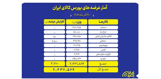 تالارهای بورس کالای ایران امروز یکشنبه ۳۰ آذرماه میزبان عرضه ۲ میلیون و ۴۳۶ هزار و ۵۶۴ تن انواع محصول است.