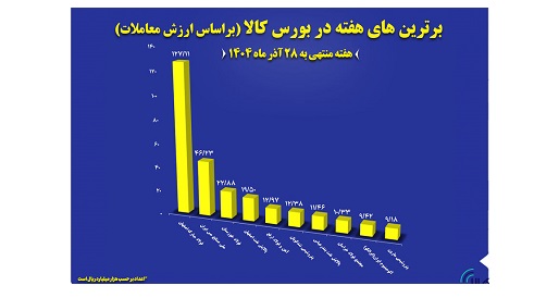 آمار معاملات بازار فیزیکی بورس کالای ایران نشان می دهد در هفته منتهی به ۲۸ آذر ماه حدود ۲ میلیون و ۶۶۲ هزار تن انواع کالا و محصول به ارزش بالغ بر ۶۱.۶ هزار میلیارد تومان معامله شد. همچنین ارزش معاملات ۱۰ شرکت برتر به بیش از ۲۸.۱ هزار میلیارد تومان رسید.