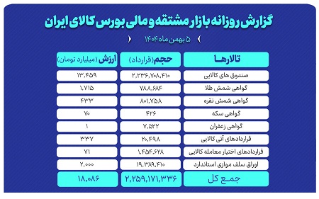 روز گذشته در بازار مشتقه و مالی بورس کالای ایران بالغ بر ۲ میلیارد و ۲۵۹ میلیون قرارداد به ارزش ۱۸هزار میلیارد تومان منعقد شد.