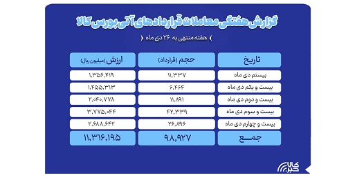 بررسی روند معاملات قراردادهای آتی بورس کالای ایران درهفته منتهی به ۲۶ دی ماه نشان می دهد که در هفته گذشته ارزش معاملات بازار آتی به بیش از هزار و ۱۳۱ میلیارد تومان رسید.