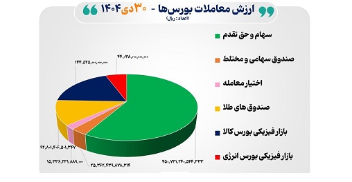 دادههای مدیریت نظارت بر بورسهای سازمان بورس و اوراق بهادار نشان میدهد در روز سهشنبه ۳۰ دی ۱۴۰۴ مجموع ارزش معاملات بورس تهران و فرابورس شامل: سهام و حق تقدم، صندوقهای سهامی و مختلط، اختیار معامله و صندوقهای طلای بورس کالا و همچنین مبادلات انجام شده در بازارهای فیزیکی بورسهای کالا و انرژی به ۷۷ هزار و ۲۷۹ میلیارد تومان رسید.