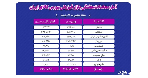 در معاملات هفته گذشته بازار فیزیکی بورس کالای ایران ۲ میلیون و ۸۴۵ هزار و ۷۹۷ تن انواع محصول به ارزش ۷۳.۱ هزار میلیارد تومان دادوستد شد.