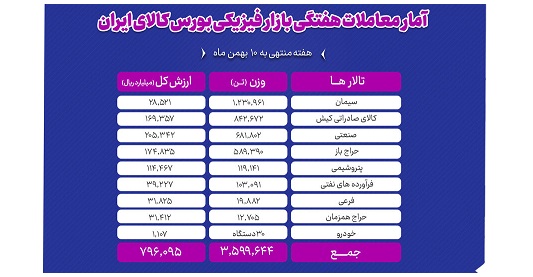 در معاملات هفته گذشته بازار فیزیکی بورس کالای ایران ۳ میلیون و ۵۹۹ هزار و ۶۴۴ تن انواع محصول به ارزش ۷۹.۶ هزار میلیارد تومان دادوستد شد.