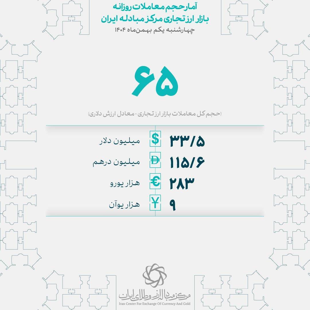 در جریان معاملات روز چهارشنبه یکم بهمن‌ماه ۱۴۰۴، ارزش دادوستدهای بازار ارز تجاری مرکز مبادله ایران به ۶۵ میلیون دلار رسید.
