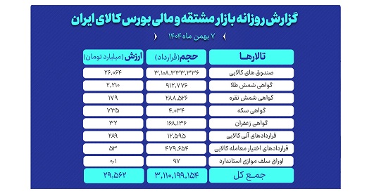 روز گذشته در بازار مشتقه و مالی بورس کالای ایران بالغ بر ۳ میلیارد و ۱۱۰ میلیون قرارداد به ارزش ۲۹.۵ هزار میلیارد تومان منعقد شد.