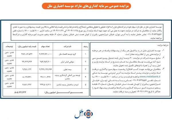 موسسه اعتباری ملل با انتشار آگهیرمزایده عمومی در نظر دارد سهام متعلق به خود در شرکت های گروه توسعه اقتصاد ملل، شرکت سهامی فرش ایران، بیمه تعاون، شرکت توسعه بین المللی گردشگری پدیده شاندیز و ابنیه و ساختمان پدیده شاندیز را واگذار نماید.