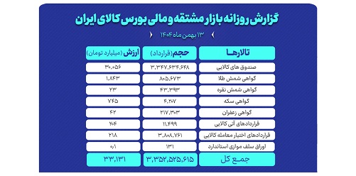 روز گذشته در بازار مشتقه و مالی بورس کالای ایران بالغ بر ۳ میلیارد و ۳۵۲ میلیون قرارداد به ارزش ۳۳ هزار میلیارد تومان منعقد شد.