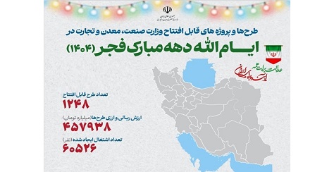 همزمان با ایامالله دهه مبارک فجر و چهل و هفتمین سالگرد پیروزی شکوهمند انقلاب اسلامی، وزارت صنعت، معدن و تجارت ۱۲۴۸ طرح و پروژه ملی و استانی را در سراسر کشور افتتاح میکند.