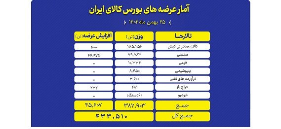 تالارهای بورس کالای ایران در روز شنبه ۲۵ بهمن ماه میزبان عرضه ۴۳۳ هزار و ۵۱۰ تن انواع محصول هستند.