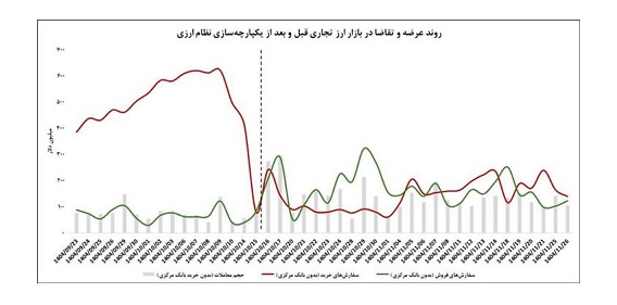 پس از اصلاح سیاستهای ارزی، تقاضای ارز روزانه 600 میلیون دلاری در بازار ارز تجاری، به طور متوسط، به کمتر از 200 میلیون دلار و حجم عرضه ارز در این بازار، از کمتر از 100 میلیون دلار به حدود متوسط 200 میلیون دلار رسیده است. بر این اساس با وجود افزایش مانده تخصیص ارز به بیش از دو برابر، مازاد تقاضای ارز 500 میلیون دلاری به مازاد عرضه در بازار ارز تجاری تبدیل شد.