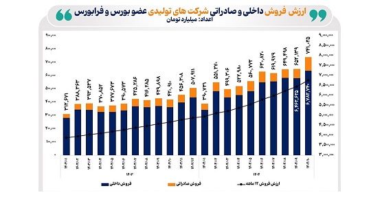 در دی ۱۴۰۴ فروش داخلی حدود ۱۰ درصد و فروش صادراتی ۴۶ درصد نسبت به ماه قبل افزایش یافت. در نتیجه این عملکرد، ارزش فروش ماهانه شرکت‌ها مجموعاً حدود ۱۴ درصد نسبت به ماه آذر افزایش یافته و از ۶۵۲ همت به رقم بی‌سابقه ۷۴۱ همت رسید.