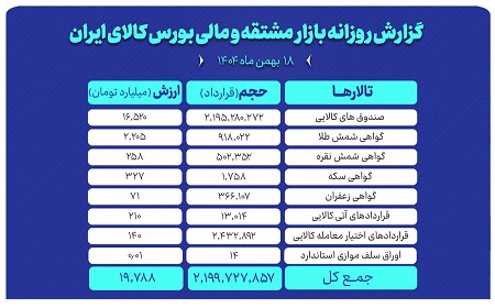 روز گذشته در بازار مشتقه و مالی بورس کالای ایران بالغ بر ۲ میلیارد و ۱۹۹ میلیون قرارداد به ارزش ۱۹.۷هزار میلیارد تومان منعقد شد.