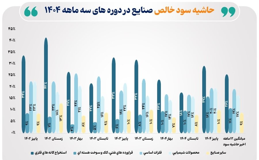 داده‌های این گزارش حاکی از آن است که حاشیه سود خالص صنایع استخراج کانه‌های فلزی، فرآورده‌های نفتی، فلزات اساسی و محصولات شیمیایی در پاییز امسال به ترتیب ۲۹، ۱۶، ۲۰ و ۲۰ درصد بوده است. حاشیه سود خالص این صنایع در تابستان امسال به ترتیب ۱۸، ۱۰، ۱۷ و ۱۶ درصد برآورد شده بود./سنا