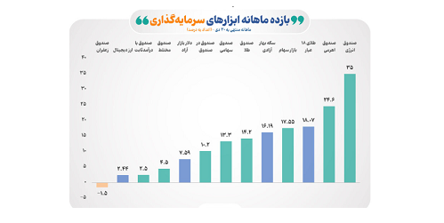 طبق اطلاعات مرکز نظارت بر صندوق‌های سرمایه‌گذاری سازمان بورس و اوراق بهادار، بازده ماهانه صندوق‌های سرمایه‌گذاری در اوراق بهادار مبتنی بر کالا (طلا)، صندوق‌های سهامی، صندوق در صندوق‌ها، صندوق‌های مختلط و صندوق‌های سرمایه‌گذاری در اوراق بهادار با درآمد ثابت به ترتیب مثبت «۱۴.۲»، «۱۳.۳»، «۱۰.۲»، «۴.۵» و «۲.۵» درصد بوده است.