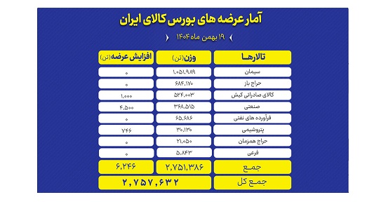تالارهای بورس کالای ایران امروز یکشنبه ۱۹ بهمن ماه میزبان عرضه ۲ میلیون و ۷۵۷ هزار و ۶۳۲ تن انواع محصول است.