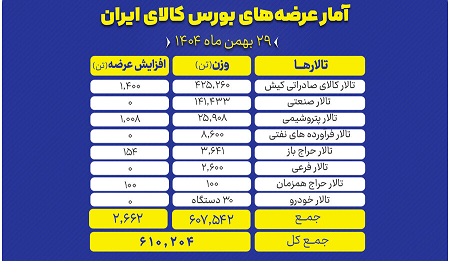 تالارهای بورس کالای ایران امروز چهارشنبه ۲۹ بهمن ماه، میزبان عرضه ۶۱۰ هزار و ۲۰۴ تن انواع محصول است.
