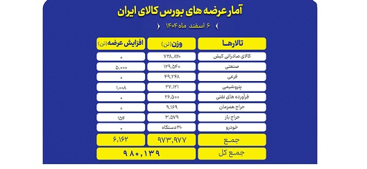 تالارهای بورس کالای ایران امروز چهارشنبه ۶ اسفند ماه، میزبان عرضه ۹۸۰ هزار و ۱۳۹ تن انواع محصول است.