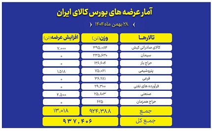 تالارهای بورس کالای ایران امروز سهشنبه ۲۸ بهمن ماه میزبان عرضه ۹۳۷ هزار و ۴۰۶ تن انواع محصول است.