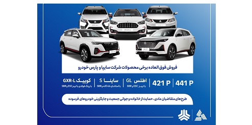 به گزارش فراسو به نقل از سایپانیوز، فروش فوق العاده خودروهای 441P،  421P، اطلس GL با ترمز ESC و SBR ، ساینا S با استاندارد 85 گانه و SBR و كوييک GXR-L رینگ فولادی با ترمز ESC و SBR از ساعت ۱۰ صبح روز سه‌شنبه 21 بهمن ماه آغاز می‌شود و تا ساعت 24 روز شنبه 25 بهمن ماه ادامه خواهد یافت.