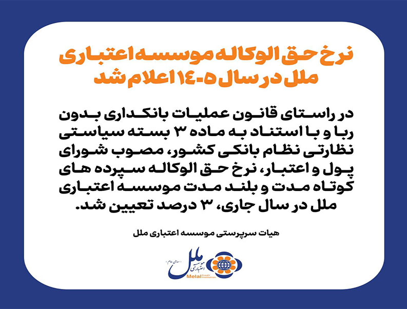موسسه اعتباری ملل در اطلاعیه ای نرخ حق الوکاله سال ۱۴۰۵ این موسسه را 3 درصد اعلام کرد. به گزارش فراسو، متن کامل این اطلاعیه بدین شرح است: