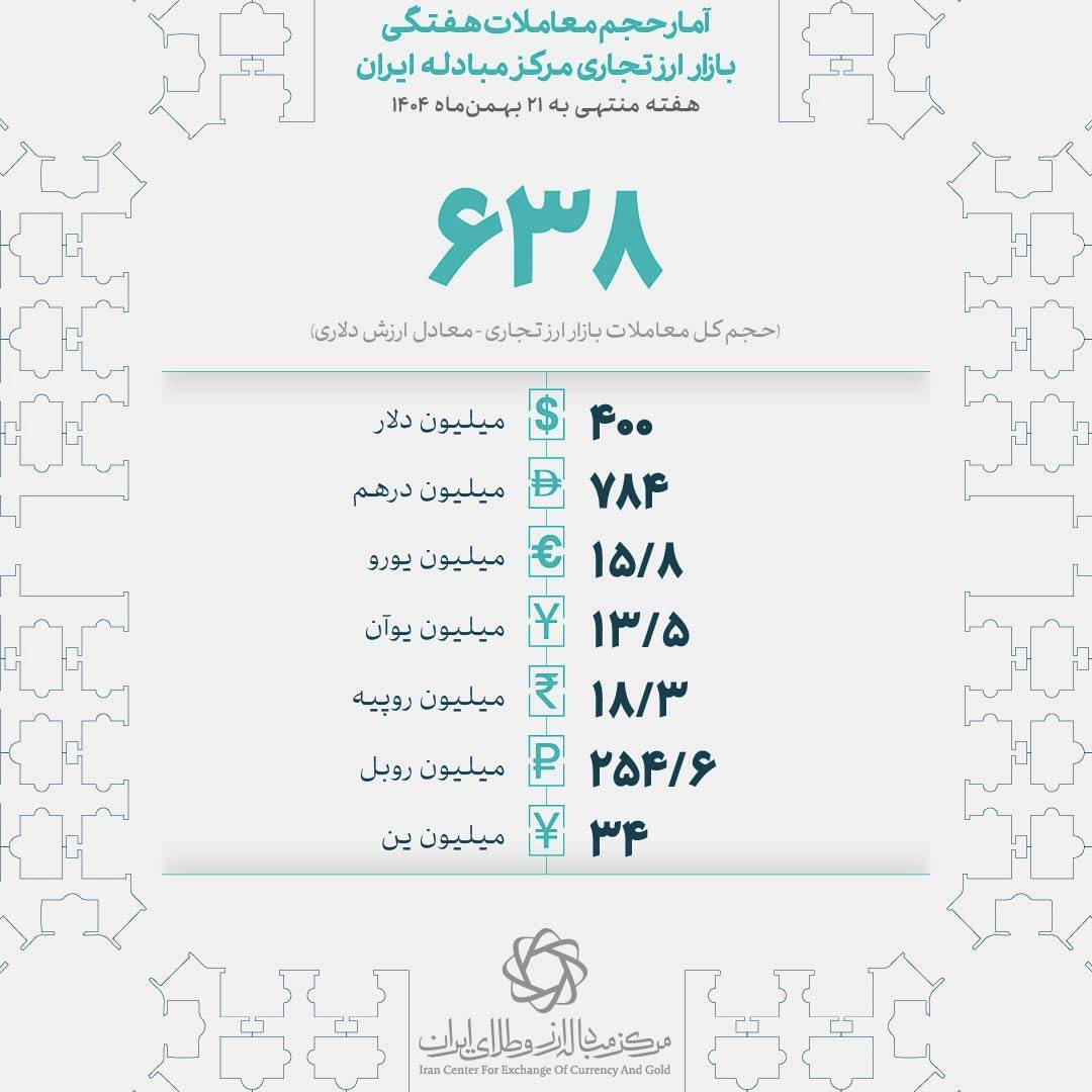 در هفته منتهی به ۲۱ بهمنماه ۱۴۰۴، و طی چهار روز کاری، بازار ارز تجاری مرکز مبادله ایران معاملاتی به ارزش بیش از ۶۳۷.۷ میلیون دلار ثبت کرد.