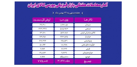 در معاملات هفته گذشته بازار فیزیکی بورس کالای ایران ۳ میلیون و ۱۴۷ هزار و ۵۰ تن انواع محصول به ارزش ۷۷.۵ هزار میلیارد تومان دادوستد شد.