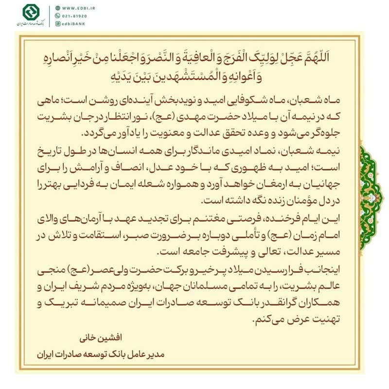 پیام تبریک مدیرعامل بانک توسعه صادرات ایران به مناسبت ولادت حضرت مهدی موعود (عج)