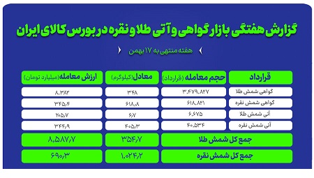 بررسی عملکرد ابزارهای مبتنی بر طلا و نقره در بورس کالای ایران نشان می‌‎دهد که در هفته گذشته بیش از یک تن شمش نقره و حدود ۳۵۵ کیلوگرم شمش طلا در بازار گواهی سپرده و آتی معامله شد.