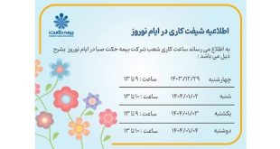 بیمه حکمت صبا با درک اهمیت ارائه خدمات مطلوب و بیوقفه به مشتریان خود به ویژه در ایام تعطیلات نوروز ، تمهیدات ویژهای را برای فعالیت شعب خود در این ایام در نظر گرفته است.