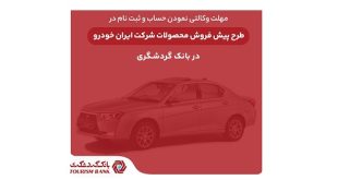 ثبتنام در طرح پیشفروش محصولات شرکت ایرانخودرو با وکالتی کردن حساب نزد بانک گردشگری فراهم شده است.