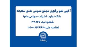 ادامه ...اعلام لغو برگزاری مجمع عمومی عادی سالیانه بانک تجارت