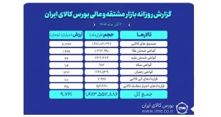 ادامه ...ارزش معاملات 2 آذرماه بازار مشتقه و مالی بورس کالا از ۹.۷ همت عبور کرد