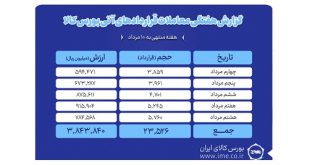 بررسی روند معاملات قراردادهای آتی بورس کالای ایران درهفته منتهی به ۱۰ مرداد نشان می دهد که در هفته گذشته ارزش معاملات بازار آتی به بیش از ۳۸۴ میلیارد تومان رسید.