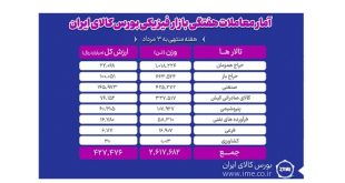 آمار معاملات بازار فیزیکی بورس کالای ایران نشان می دهد در هفته منتهی به ۳ مرداد تیر ماه حدود ۲ میلیون و ۲۷۲ تن انواع کالا و محصول به ارزش بالغ بر ۳۴.۳ هزار میلیارد تومان معامله شد.