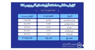 بررسی روند معاملات قراردادهای آتی بورس کالای ایران درهفته منتهی به ۳ مرداد نشان می دهد که در هفته گذشته ارزش معاملات بازار آتی به بیش از ۴۱۷ میلیارد تومان رسید.