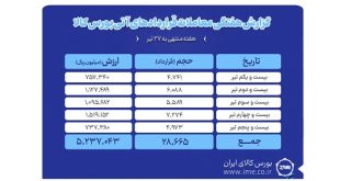 بررسی روند معاملات قراردادهای آتی بورس کالای ایران درهفته منتهی به ۲۷ تیرماه نشان می دهد که در هفته گذشته ارزش معاملات بازار آتی به بیش از ۵۲۳ میلیارد تومان رسید.