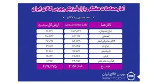 در معاملات هفته گذشته (هفته منتهی به ۲۷ تیر) بازار فیزیکی بورس کالای ایران ۲ میلیون و ۱۵۶ هزار و ۶۰۶ تن انواع محصول به ارزش ۴۳.۹ هزار میلیارد تومان دادوستد شد.