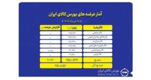 تالارهای بورس کالای ایران در روز سهشنبه ۲۴ تیرماه معامله ۴۰۱ هزار و ۶۱۰ تن محصول به ارزش ۹.۳ هزار میلیارد تومان را ثبت کردند. در این روز تالار حراج همزمان با داد و ستد ۱۸۹ هزار تن محصول پیشتاز معاملات بورس کالا بود.
