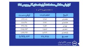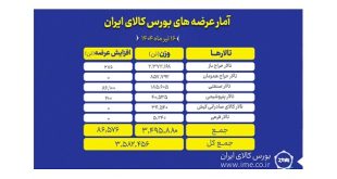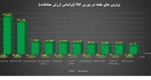 در هفته منتهی به ۱۳ تیر ماه حدود ۲ میلیون و ۸۹ هزار و ۱۳۲ تن انواع کالا و محصول به ارزش بالغ بر ۴۰.۴ هزار میلیارد تومان معامله شد.همچنین ارزش معاملات ۱۰ شرکت برتر به بیش از ۱۵.۳ هزار میلیارد تومان رسید.