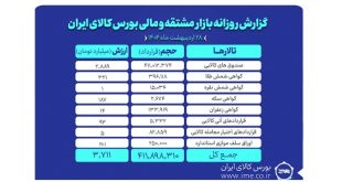 تالارهای بورس کالای ایران در روز یکشنبه ۲۸ اردیبهشت ماه میزبان یک میلیون و ۶۵۲ هزار تن محصول بود.