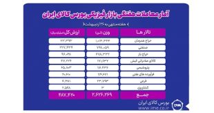 تالار صادراتی بورس کالای ایران هفته گذشته میزبان معامله ۱۷۱ هزار و ۶۳۲ تن انواع کالا و محصول به ارزش ۳ هزار و ۸۸۱ میلیارد تومان بود.