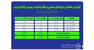 بررسی عملکرد ابزارهای مبتنی بر طلا و نقره در بورس کالای ایران نشان میدهد که در هفته گذشته در مجموع ۲۵۷.۷ کیلوگرم شمش نقره و ۱۷۸.۱ کیلوگرم شمش طلا در بازار گواهی سپرده و آتی معامله شد.
