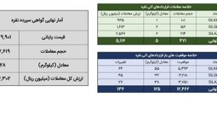 در روز ۲۳ اردیبهشت ماه در مجموع حدود ۳۲ کیلوگرم شمش نقره در بازار گواهی سپرده و قرارداد آتی مورد معامله قرار گرفت.