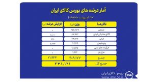 تالارهای بورس کالای ایران در روز چهارشنبه ۱۷ اردیبهشتماه میزبان معامله ۱۸۳ هزار و ۳۵۹ تن محصول بود.