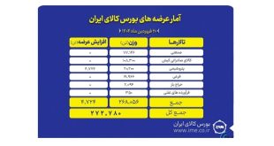 تالارهای بورس کالای ایران (چهارشنبه ۲۰ فروردینماه) میزبان عرضه ۲۷۲ هزار و ۷۸۰ تن انواع کالا و محصول است.