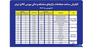 براساس اطلاعیه ۱۹ اسفندماه ۱۴۰۳ بورس کالای ایران مبنی بر افزایش ساعت معاملاتی در بازارهای مشتقه و مالی این بورس، به این ترتیب از امرورز- ۱۸ فروردین ماه - ساعت معاملات صندوق های طلا از ۱۱:۳۰ تا ۱۸ است.