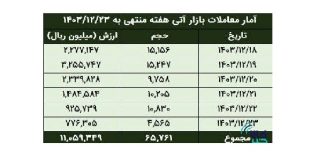 در هفته منتهی به ۲۴ اسفند در مجموع معادل ۶۸۶.۴ کیلوگرم شمش طلا و معادل ۱.۹۱۱.۴ کیلوگرم شمش نقره( بیش از ۱.۹ تن) در بازار گواهی سپرده کالایی و آتی مورد معامله قرار گرفت.
