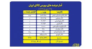 تالارهای بورس کالای ایران امروز چهارشنبه ۱۷ دی ماه میزبان عرضه ۷۱۸ هزار و ۴۰۱ تن انواع محصول است.